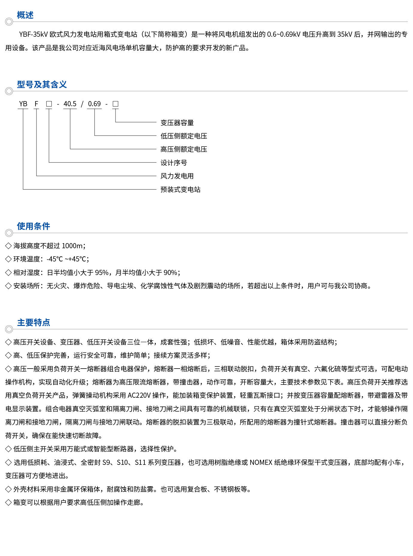 YBF-35kV歐式風力發電站用箱式變電站(以下簡稱箱變)是一種將風電機組發出的0.6~0.69kV電壓升高到35kV后,并網輸出的專用設備。該產品是我公司對應近海風電場單機容量大,防護高的要求開發的新產品。