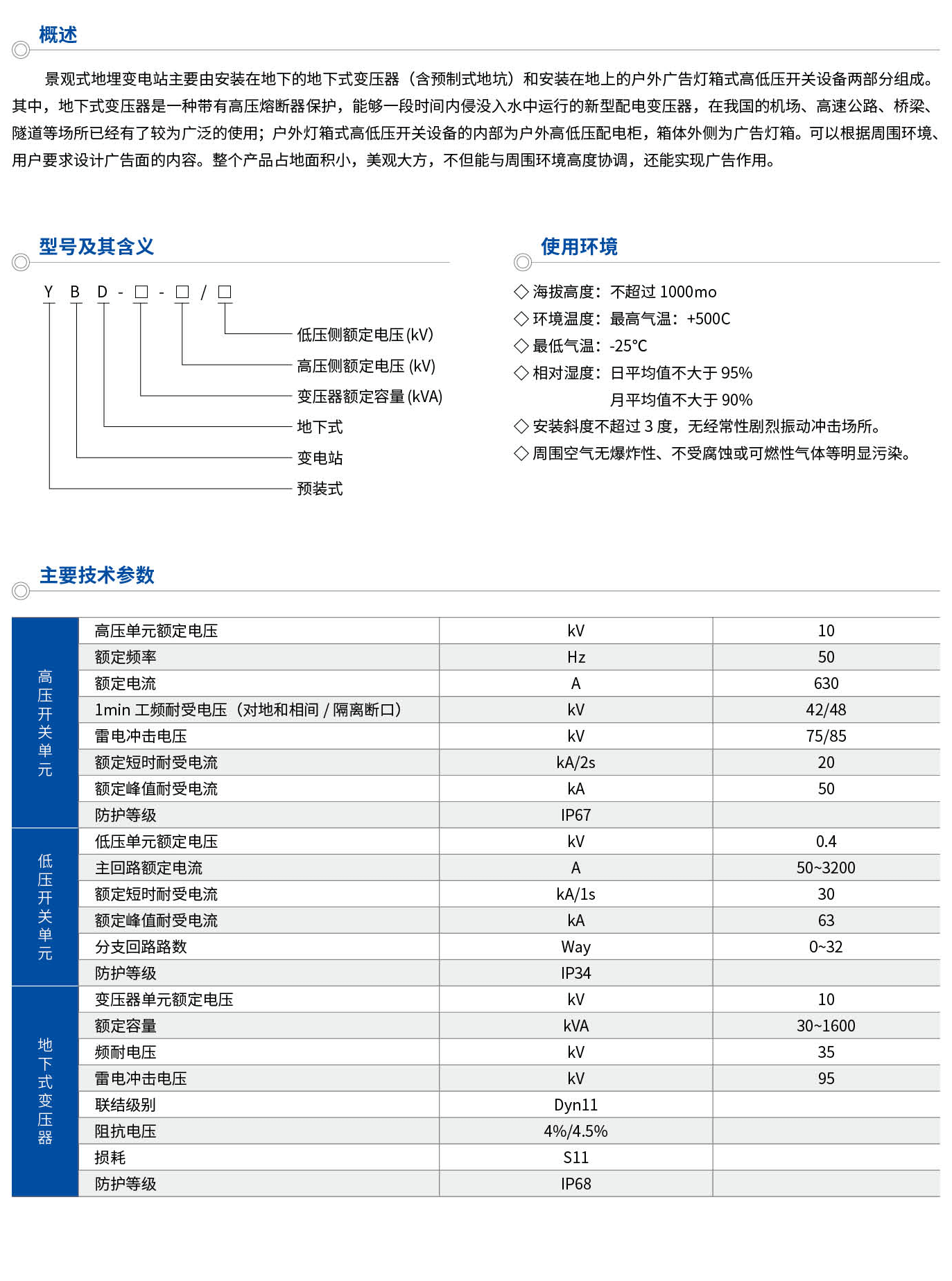 景觀式地埋變電站主要由安裝在地下的地下式變壓器(含預制式地坑)和安裝在地上的戶外廣告燈箱式高低壓開關設備兩部分組成。其中,地下式變壓器是一種帶有高壓熔斷器保護,能夠一段時間內侵沒入水中運行的新型配電變壓器,在我國的機場、高速公路、橋梁、隧道等場所已經有了較為廣泛的使用;戶外燈箱式高低壓開關設備的內部為戶外高低壓配電柜,箱體外側為廣告燈箱。可以根據周圍環境、用戶要求設計廣告面的內容。整個產品占地面積小,美觀大方,不但能與周圍環境高度協調,還能實現廣告作用。